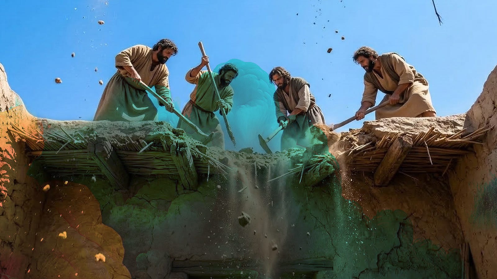 On the roof, they start digging. The roof is made of wooden beams covered with packed mud and thatch. They punch into the mud and tear at the thatch. Debris begins to fall into the room below. Jesus looks up and the crowd gasps. They make eye contact with the men above him through the jagged hole.