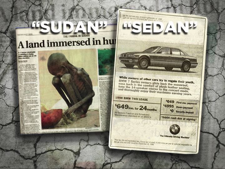 He had been relaxing one Sunday afternoon, flipping through the newspaper, when two images caught his eye. On one page: an ad for a luxury car. On the other: a Pulitzer Prize-winning photo of a starving child in Sudan, curled on the ground with a vulture in the background.